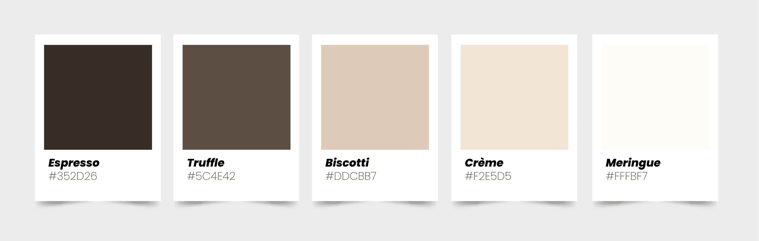 The entire palette is pulled from the feeling of the restaurant itself. Espresso and Truffle anchor everything, they're the colors you see on the bags, the aprons, the menu covers, the embossed business cards. Biscotti sits in the middle as the bridge tone, warm enough to feel inviting but muted enough to not compete with the darker shades. Crème and Meringue handle the lighter surfaces, the backgrounds, the breathing room. No bright colors, no distractions. Just tones that make you hungry and calm at the same time. Every color in this system was chosen to work on both printed materials and physical spaces, from a foil-stamped card to a stitched logo on cotton.