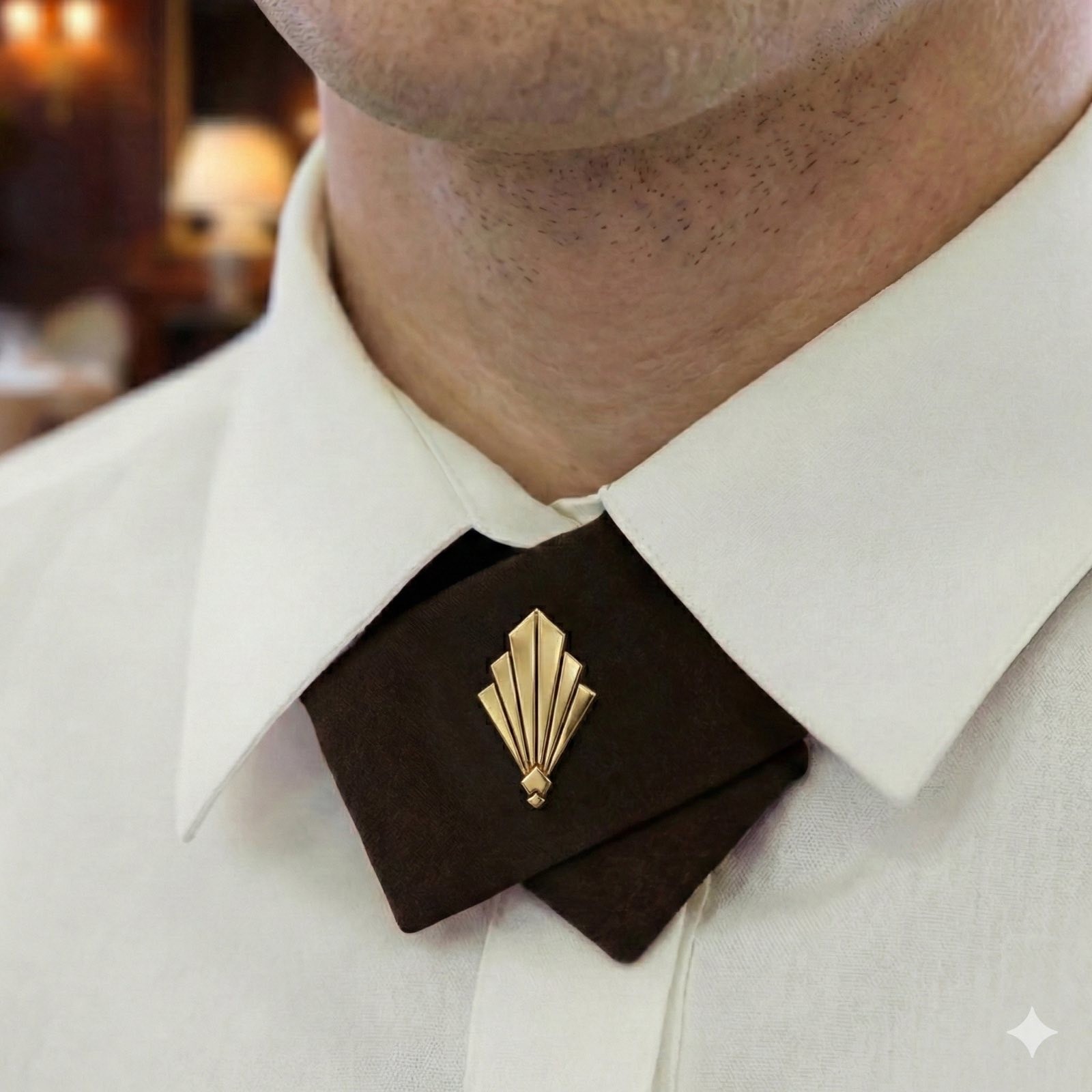 The art deco fan motif as a gold lapel pin. The moment the logo stopped being a graphic and became jewelry.