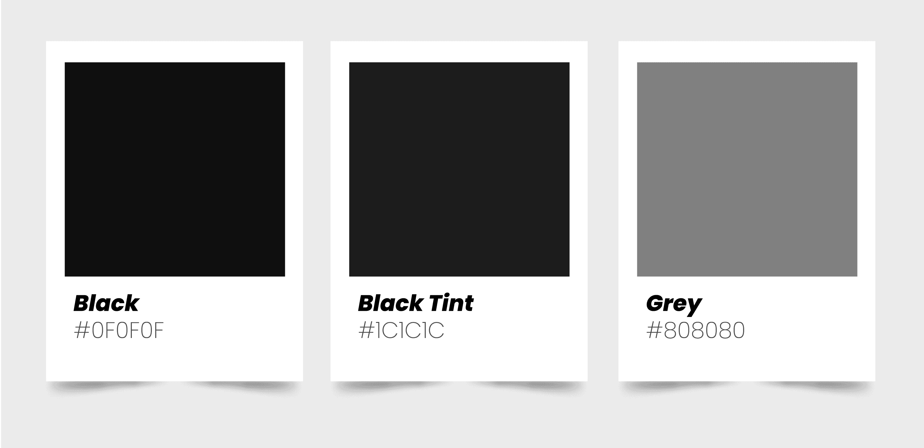 The neutral set that holds everything together. Black and Black Tint show up in the typography and fine print, the places where legibility matters more than warmth. Grey works as the quiet utility color for secondary text, dividers, and anything that needs to exist without asking for attention. These three don't steal the show, they just make sure the brand colors have something solid to land on. Think of them as the white tablecloth under the fancy plates.